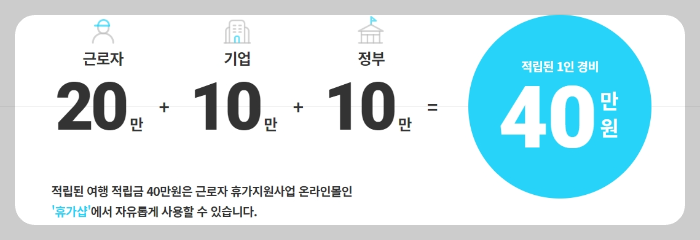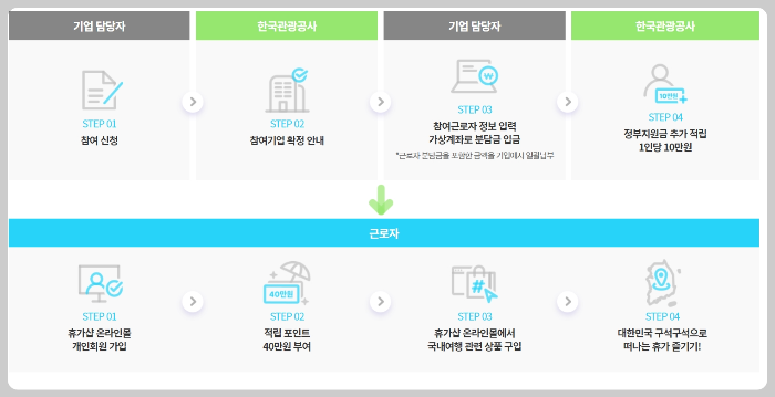 근로자 휴가를 지원해주는 사업으로 직장 내 자유로운 휴가 문화 조성과 국내여행 활성화를 위해 정부와 기업이 함께 근로자의 국내 여행경비를 지원하는 사업입니다.