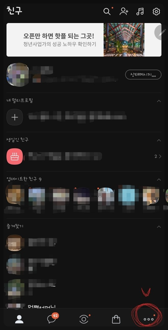 카카오톡 앱으로 들어가 보시면, 오른쪽 하단에 점 3개가 있습니다. 클릭해 주세요.