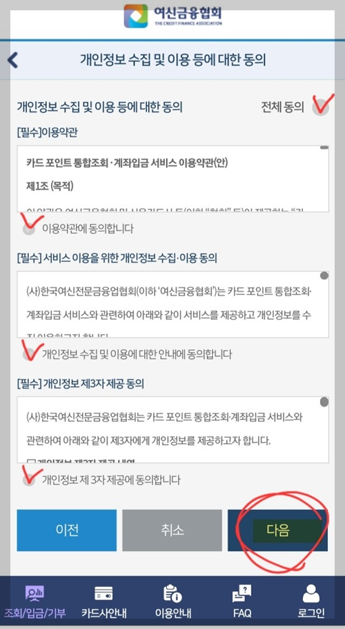 3. 동의약관페이지로 넘어가실텐데 (전체동의)체크해주시고, 오른쪽 하단에 (다음) 버튼 클릭!
