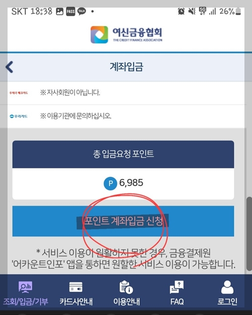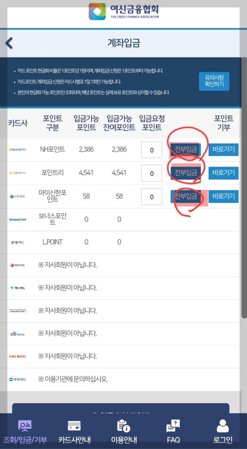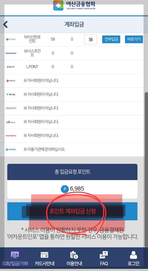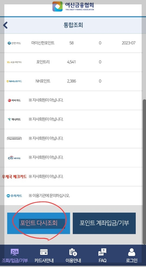 1. 이렇게 카드사별로 내가 찾을 수 있는 포인트가 조회가 되었다면, 오른쪽 하단에 (포인트 계좌입금/기부) 버튼 클릭해주시면 됩니다.