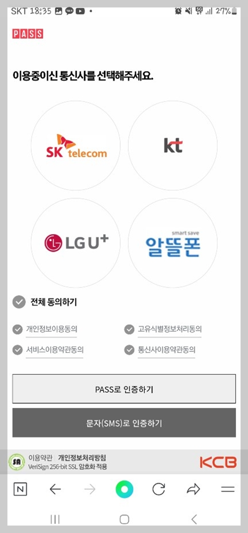 5. 이용중인 통신사 선택 후 (전체 동의하기) 체크하시고, '문자(SNS)로 인증하기' 버튼 클릭!