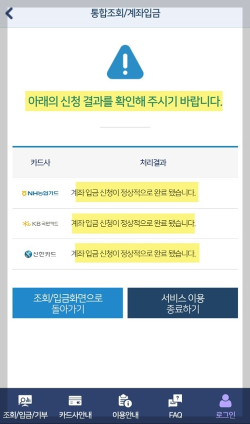 그러면 (계좌 입금 신청이 정상적으로 완료 됐습니다.) 라는 페이지가 뜹니다. 그러면 완료되신거예요. 저는 포인트 입금되기까지 시간이 조금 걸릴 줄 알았는데 바로 제가 입력한 계좌로 입금이 되더라고요. 많지는 않았지만 그래도 아이스아메리카노 커피값은 벌었습니다. 근데 이외로 이런 포인트들이 있는지 모르고 그냥 없어지는 포인트들이 많다고 해요. 가끔 카드포인트 통합조회 사이트 방문해서 조회해 보는것도 나쁠것 같지 않습니다. 내가 카드 쓰고 받은 포인트인데 못쓰고 없어지면 아깝잖아요.