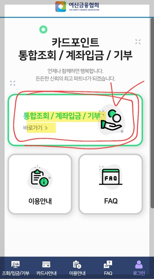 2. 위와 같은 페이지가 열리면, ' 통합조회 / 계좌입금 / 기부 ' 바로가기 버튼 제일 큰 박스 보이시죠? 클릭해 주시면 됩니다.