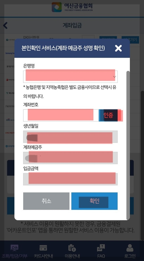 4. 그러면 (본인확인서비스) 창이 뜹니다. (은행명) 입력해주시고, (계좌번호) 입력 후 (인증) 까지 해주시면 된답니다. 그런다음 (확인) 버튼 클릭!!