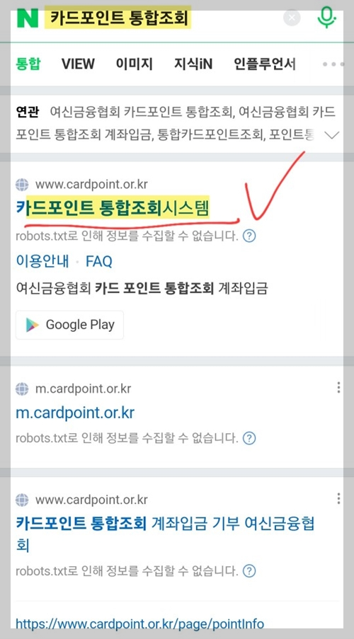 1. 먼저 나도 모르는 포인트들을 찾아낼껀데요. 네이버 검색창에 (카드포인트 통합조회) 입력해 주신다음 검색버튼 클릭 혹시 몰라 제가 바로 아래에 ' 카드포인트 통합조회 ' 사이트로 바로 신청하실 수 있게 링크 같이 걸어두도록하겠습니다. 한번 바로 조회해보시기바랍니다.