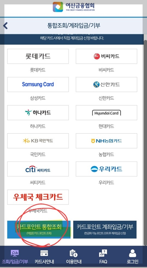 6. 여러 카드사들이 나온 페이지가 뜨실텐데요. 하단에 (카드포인트 통합조회) 버튼 보이시져?? (카드포인트 통합조회) 클릭해주세요.