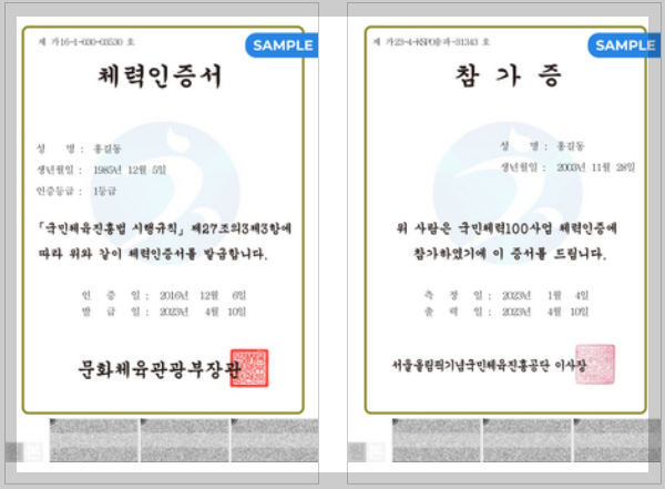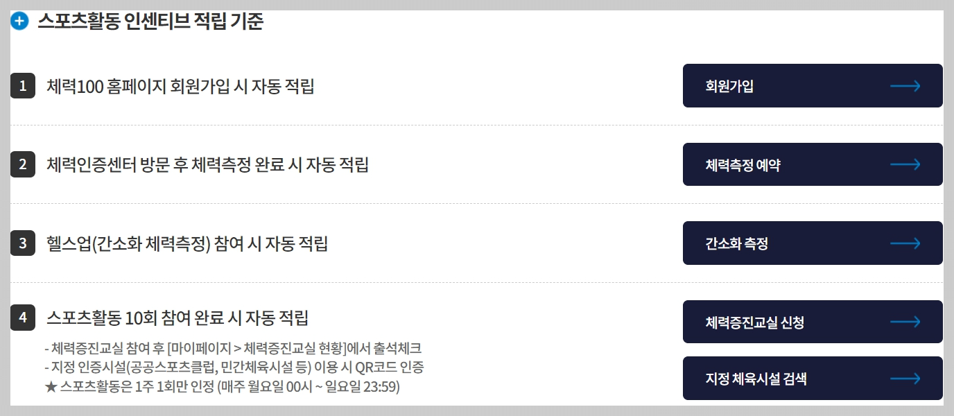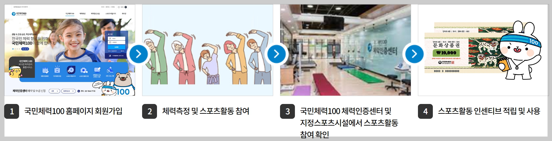 - 국민체력100 체력인증센터 및 지정스포츠시설에서 스포츠활동 참여 확인