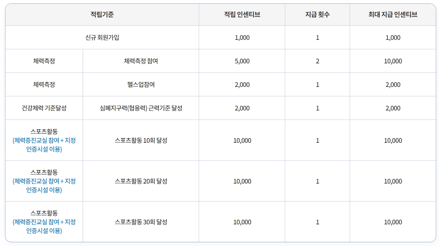 - 헬스업(간소화 체력측정) 참여 시 자동 적립됩니다.
