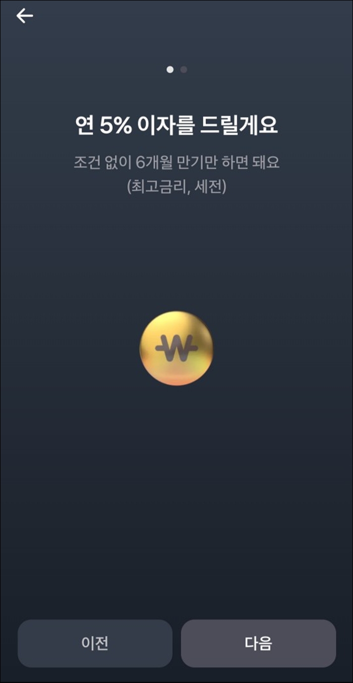 굴비적금은 연 5%의 이자를 적용해 주는데 기본금리는 연 2%이고, 조건없이 6개월 만기해지 시 추가로 연 3% 우대금리를 적용해 드립답니다. 계속 진행하시려면 오른쪽 하단 [다음] 버튼 클릭!