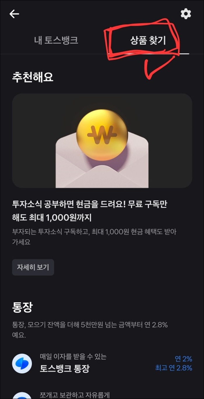 오른쪽 상단에 보시며 내 토스뱅크 옆에 [상품찾기]버튼이 보이실거예요. [상품찾기] 버튼 클릭!