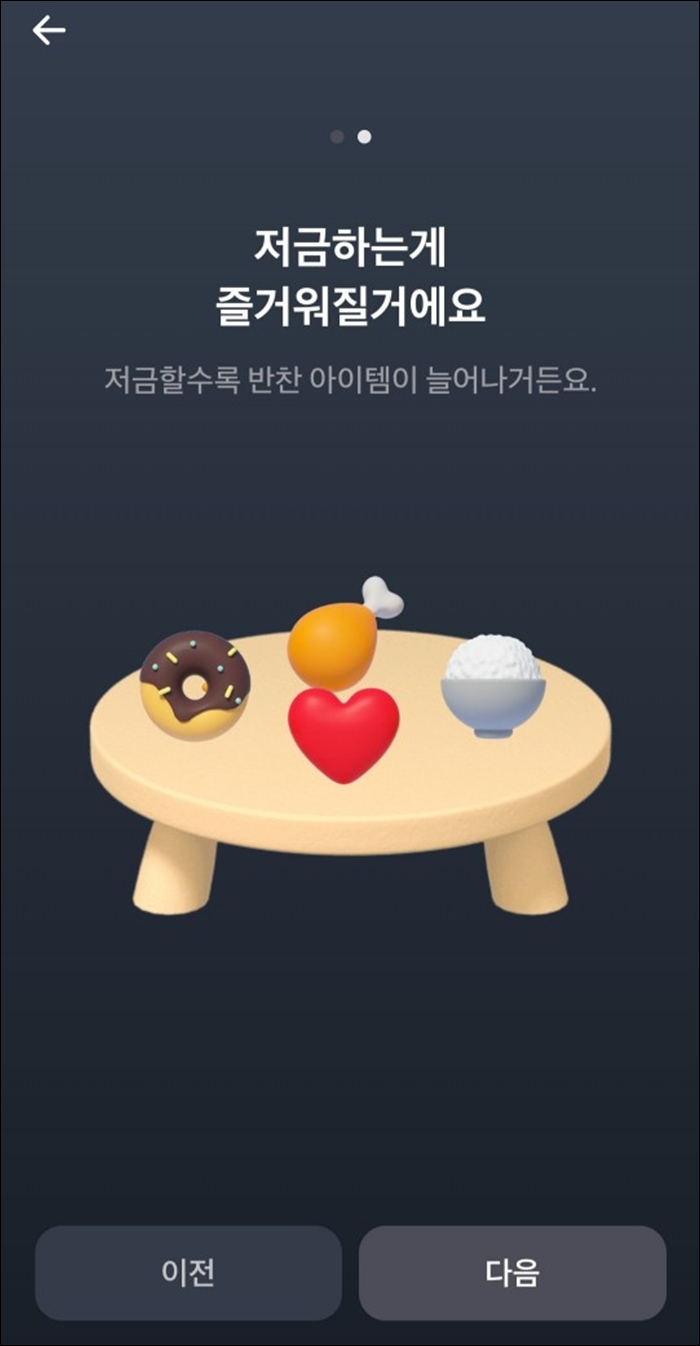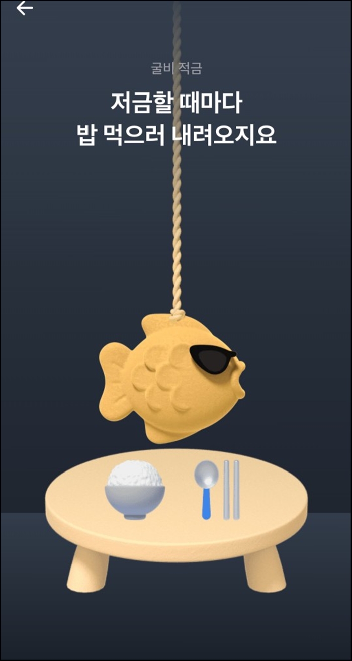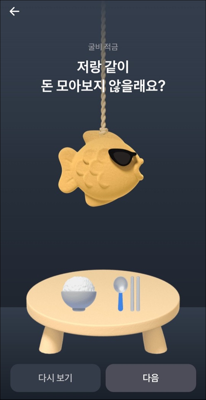 그러면 이런 [다음] 버튼 누르실 때마다 이런 페이지가 나옵니다. [굴비적금]은 고객이 매번 입금할 때마다 천장 위에 매달려 있는 굴비가 밥상으로 조금씩 내려오는데 고객이 5번 이상 저축하면 굴비가 밥상에 도달해 고객들이 원하는 반찬을 하나씩 추가할 수 있습니다. 즉 자주 저축할 수록 밥상 위의 반찬들을 더욱 풍성해져 저축의 즐거움을 느낄 수 있는데요. 고객들이 저금을 하는 과정에서 느낄 수 있는 재미가 쏠쏠합니다. [굴비적금] 가입신청하시려면 [다음] 버튼을 계속 눌러주세요.