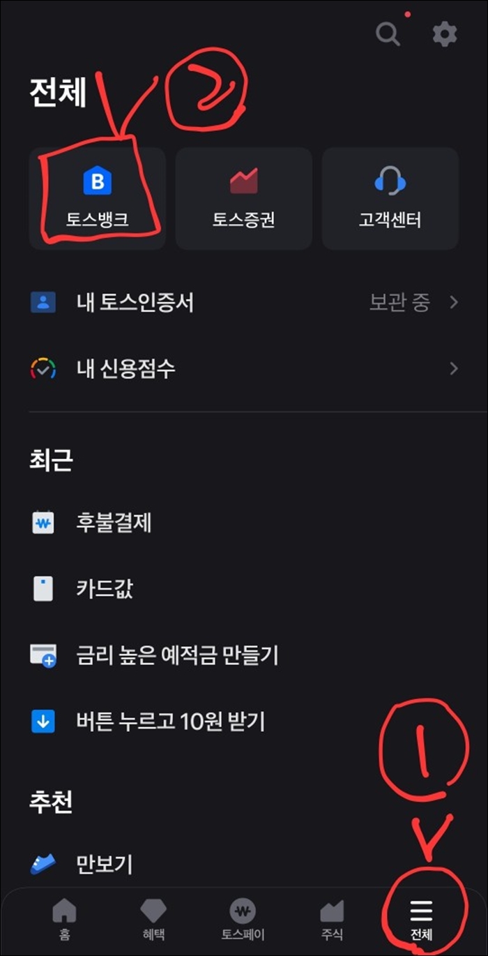 먼저 [굴비적금]을 신청하기 위해서는 토스앱을 다운받아주시고, 계좌를 만들어주시면 되시는데요. 혹시나 토스가입을 아직 못하신 이웃님들을 위해 제가 가입경로 방법 링크을 아래에 걸어두도록 하겠습니다. 보시고 차근차근 따라하시면 가입은 그리 어렵지 않으실 거예요. 토스앱으로 들어가셨다면 오른쪽 하단에 [전체]버튼 클릭! 왼쪽 상단에 [토스뱅크] 버튼 클릭!