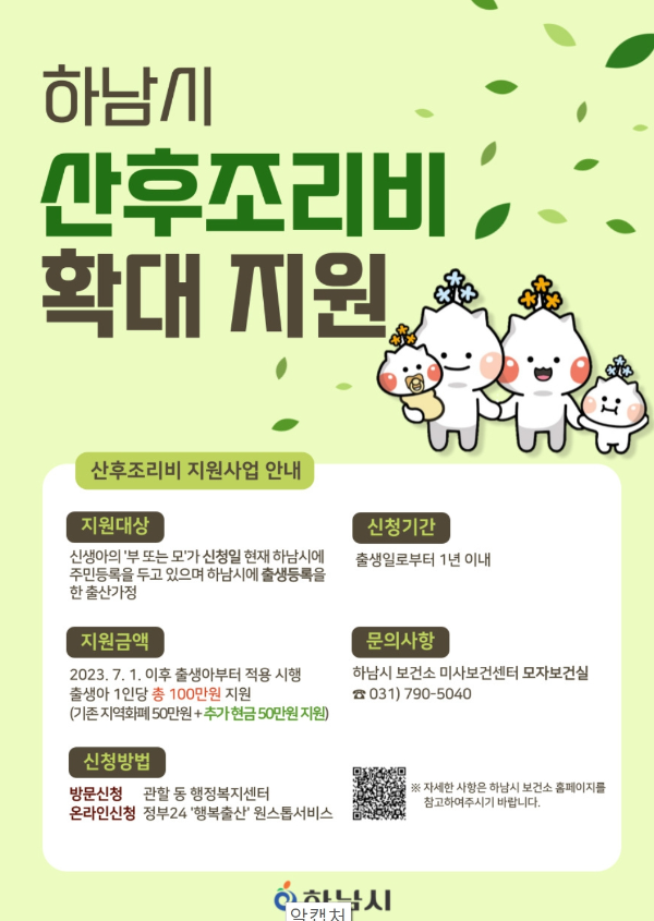 • 산후조리비 지원사업에 대한 자세한 사항은 하남시 보건소 미사보건센터 모자보건실(031-791-5040)로 문의 하시면 됩니다.
