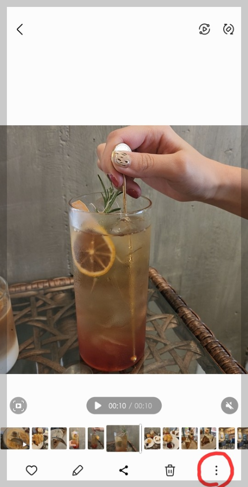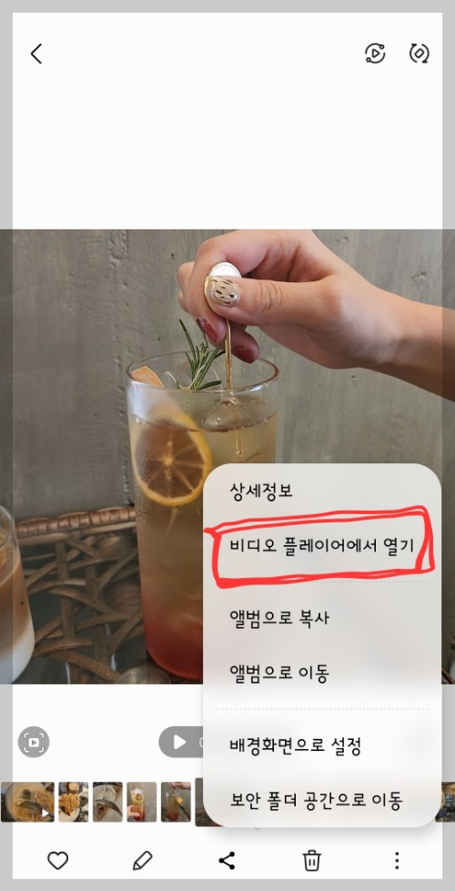 먼저 GIF로 변경하고자 하는 동영상을 갤러리에서 찾아 클릭해주세요. 그런다음 하단 우측에 점 3개 보이실거예요. 점3개 누르시면, 아래 사진처럼 [미디어 플레이어에서 열기] 클릭하시면 됩니다