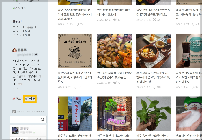 먼저 내 블로그 메인화면에서 왼쪽 하단에 [이웃커넥트] 윗쪽을 보시면 [관리]가 보이실 겁니다. [관리]로 들어갑니다.