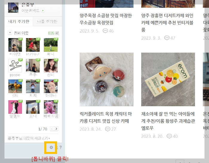☞ [나를 추가한 이웃]를 기본탭으로 설정하기 위해서 일단 [이웃커넥트]위젯 하단에 보시면 [톱니바퀴]모양이 보이실거예여. [톱니바퀴]모양 클릭해주시기 바랍니다.
