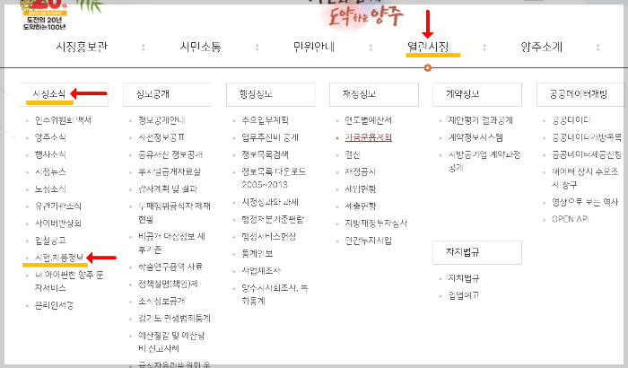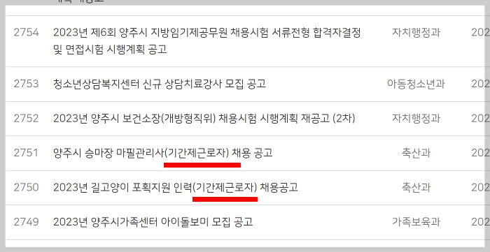 보통 홈페이지 상단 [알림마당] 또는 양주시청 같은 경우 [알림시정] 부분에 보시면 [시정 소식]이라는 게시판이 있을 것인데요. [시정 소식] 중에 [시험/채용정보]를 눌러줍니다. 다른 지자체의 경우에도 보통은 같은 방식이고, [시정 소식]이라는 게시판이 없다면, [알림부분]에 채용과 관련된 카테고리를 찾으시면 됩니다.