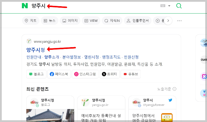 먼저 내가 사는 해당 지자체에 홈페이지로 접속해줍니다. 저는 양주시를 예를 들어서 설명을 드리도록 하겠습니다. 검색창에 양주시 검색 후 양주시청 홈페이지에 접속해주시면 됩니다.