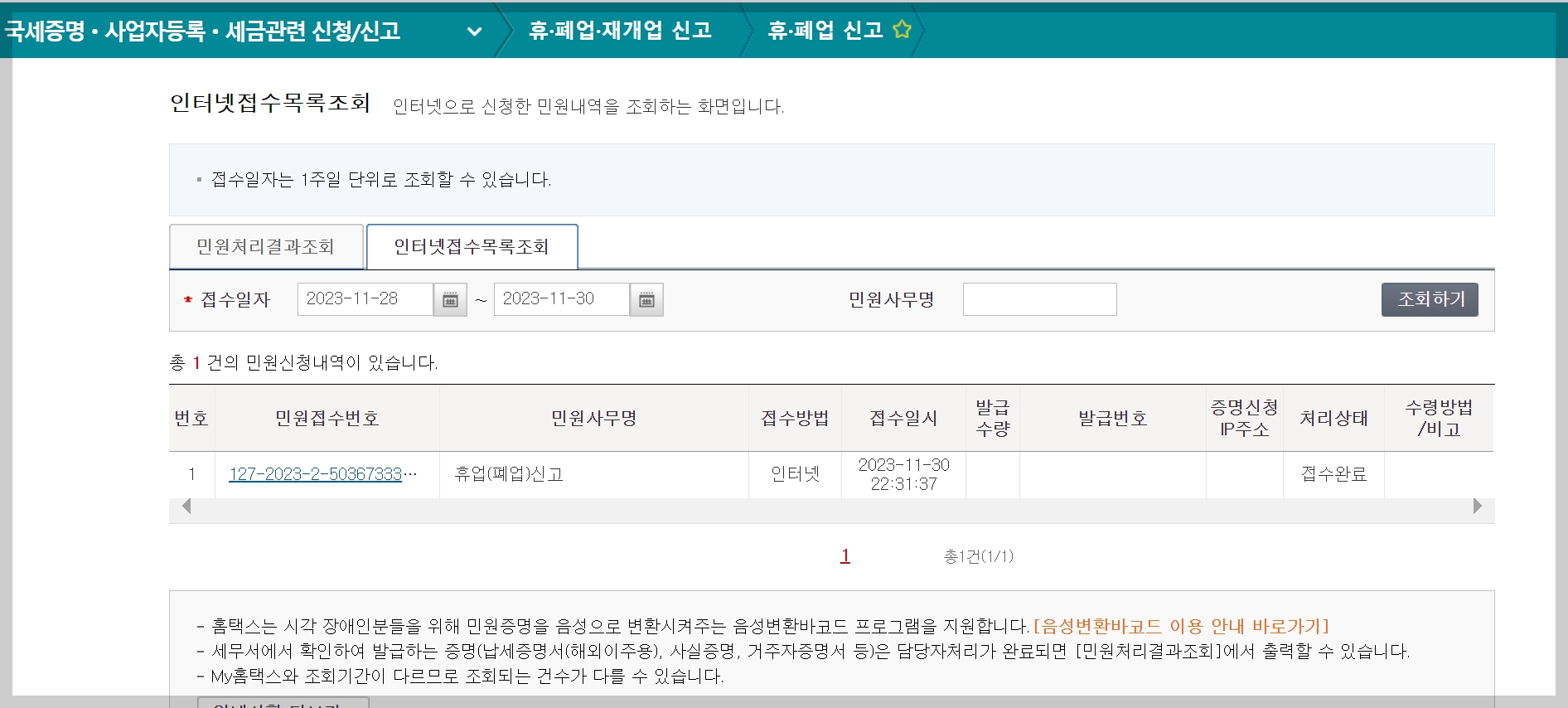 신청하시고 인터넷접수목록조회 창이 바로 뜨는데 표 우측에 [처리상태] 보시면 [접수완료]라고 입력이 되어있으실거예요. 그리고 30분 정도 지난 뒤 조회해 보면 폐업신고가 잘 되었는지 확인하실 수 있답니다.