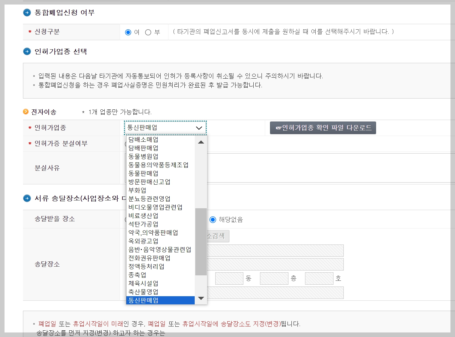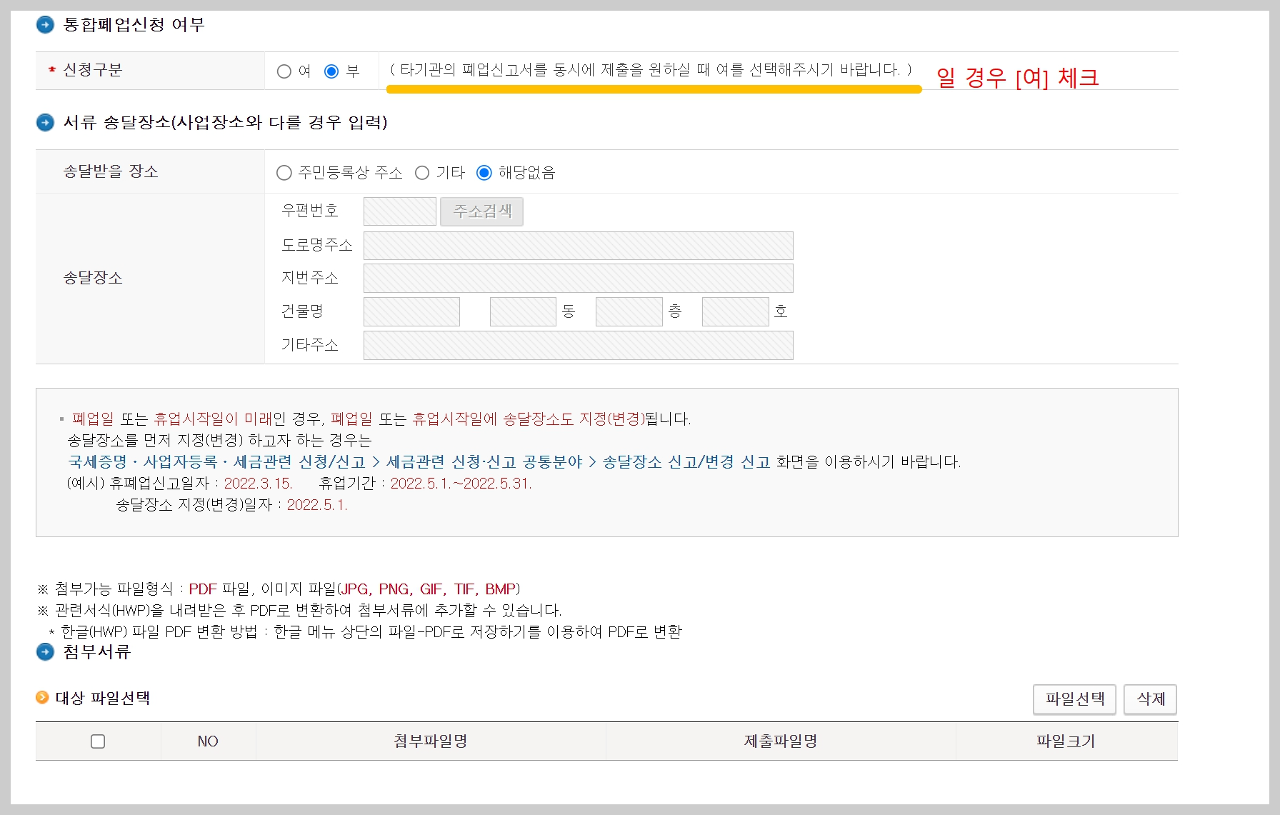 통합폐업신청여부는 타기간의 폐업신고를 동시에 제출을 원하실 때 [여]를 선택해 주시면 되는데 저같은 경우 통신판매가 있긴한데 이건 정부24에서 제가 직접 신청하려고 일단 [부]에 체크해주었답니다. 만약 통합폐업신청을 하실경우 아래 첨부해 드린 사진처럼 선택해 주시면 됩니다. [서류송당장소] 저같은 경우 아무것도 없기때문에 [해당없음]에 체크해 주었어요.