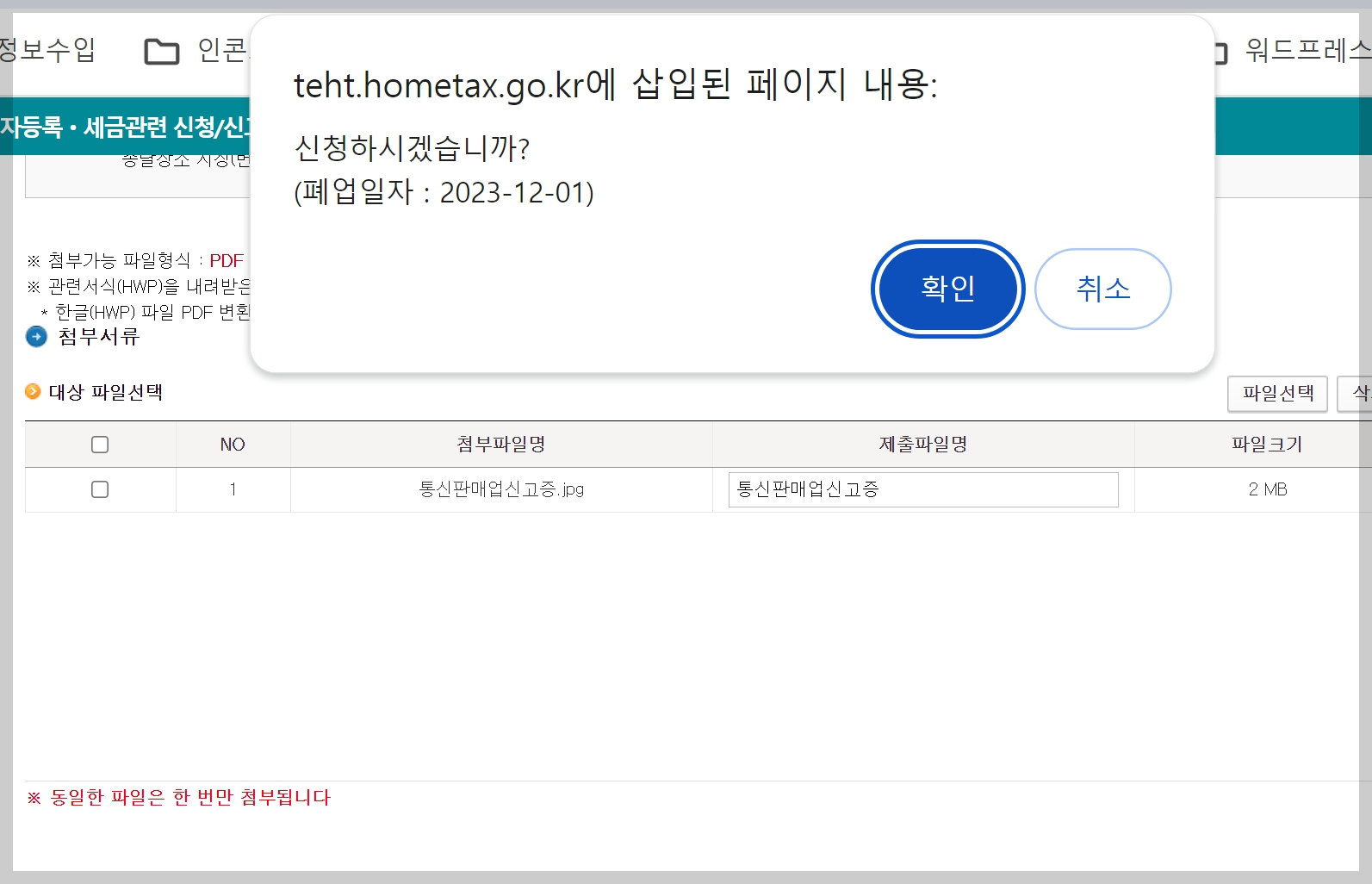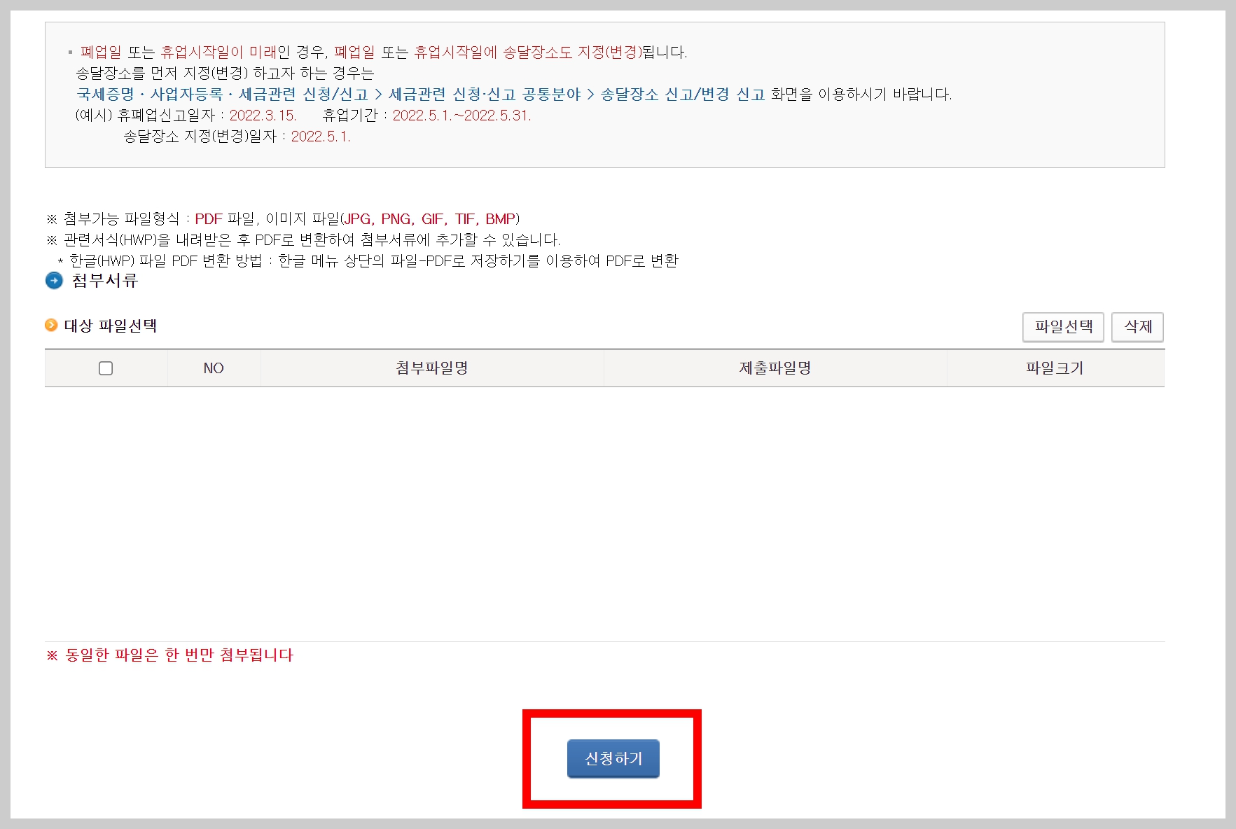 - 폐업일자는 신청하는 당일이 아니라 내일로 설정해 주시기바랍니다.