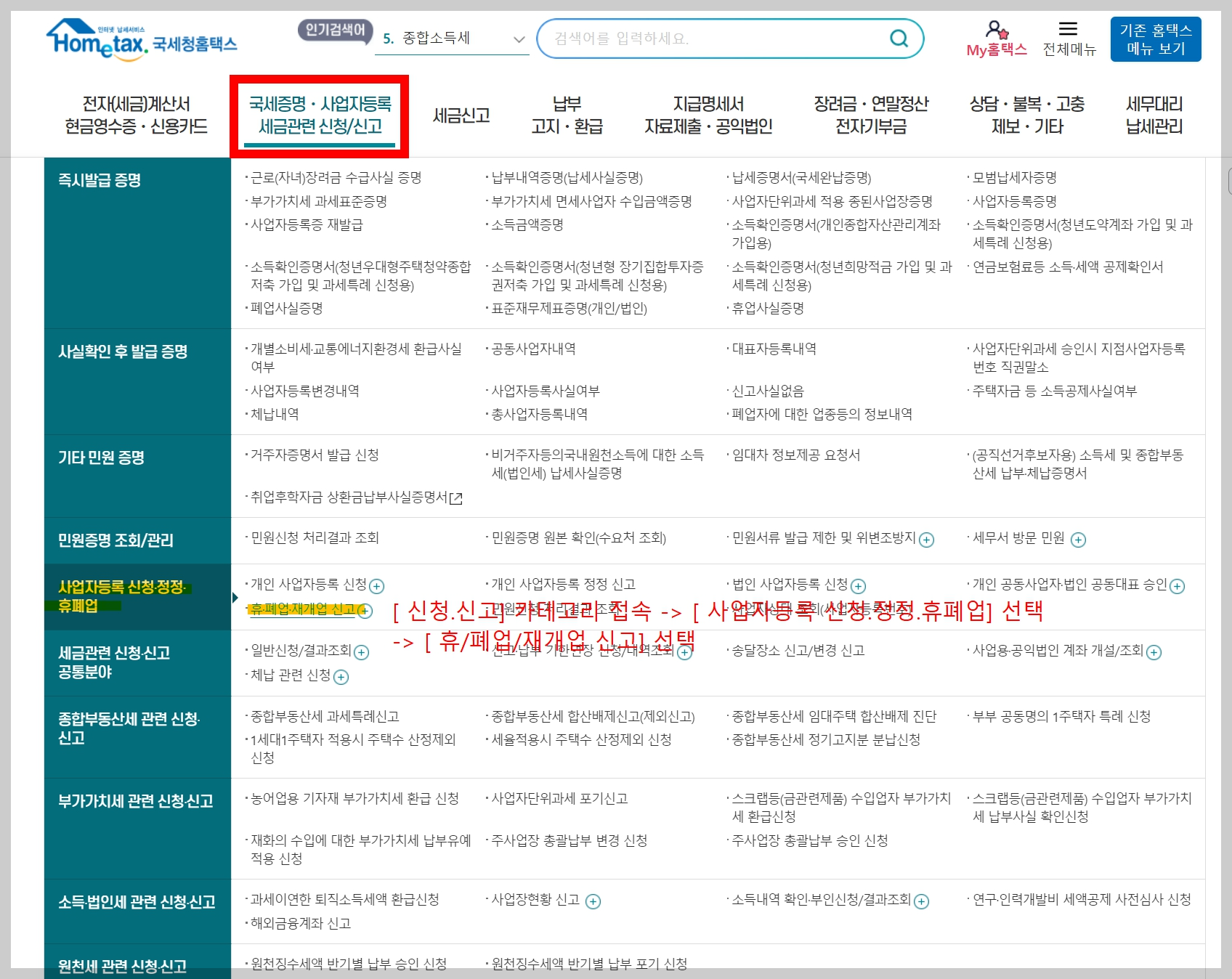상단 카테고리 중에서 [국세증명/사업자등록/세금관련/신청/신고] 카테고리 보이실거예요. 클릭해주시면 아래 화면처럼 관련 다양한 카테고리들이 보이실텐데요. 이 중에서 하단에 [사업자등록 신청/정정/휴폐업] 카테고리 마우스 갖다되면 우측으로 보이는 [휴폐업/재개업 신고] 라는 카페고리 선택해주시기 바랍니다.