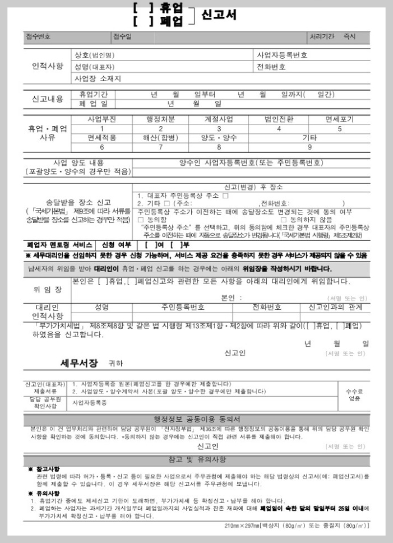 - 관할 세무서에 폐업신고를 작정 및 제출하고, 사업자등록증을 반납하여, 사업자등록번호를 말소합니다.