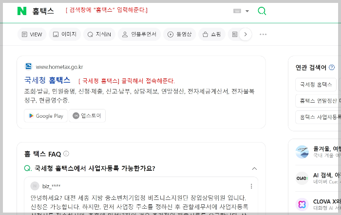 저는 온라인으로 휴/폐업 신고하는 방법에 대해 더 자세하게 알려드리고도록 하겠습니다. 먼저 검색창에 [홈택스] 입력해주시기 바랍니다. 그러면 검색창 바로 아래 하단에 [국세청 홈택스] 홈페이지 링크가 보이실거예요. 클릭 후 접속해 주시기 바랍니다.
