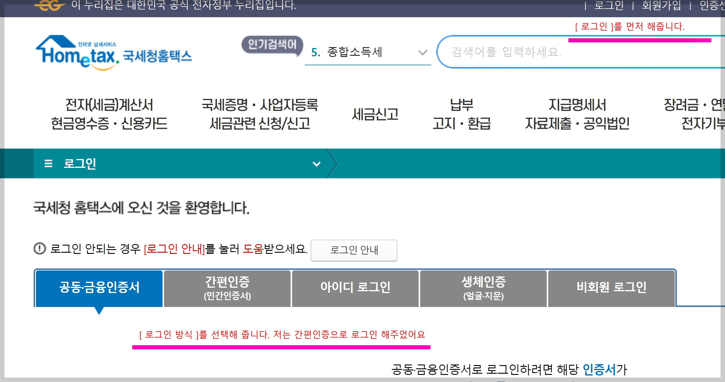 [국세청홈택스] 메인페이지에 접속해 주셨다면 로그인을 먼저 해주셔야 되는데요. 우측 상단에 [로그인] 클릭하시면 다양한 방법으로 로그인할 수 있으니 선택하셔서 알맞는 방법으로 로그인 해주시기 바랍니다. 저같은 경우 그냥 간단하게 [간편인증]으로 로그인해 이용하고 있답니다.