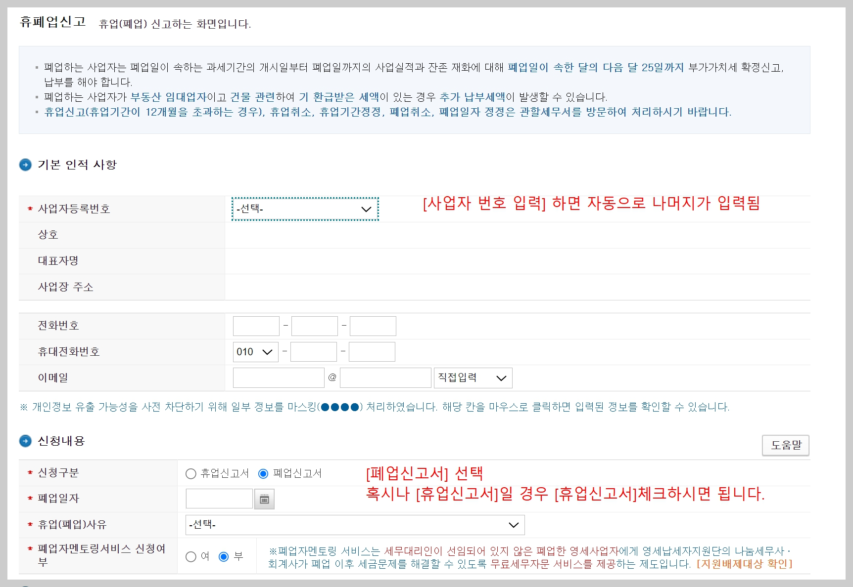여기까지 하셨다면 아마 휴업(폐업) 신고하는 화면이 보이실거예요.