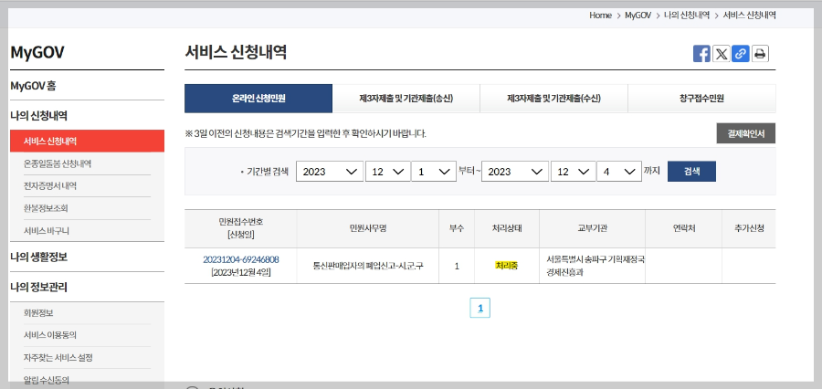 나의 신청내역에서 온라인 신청민원 보시면 표 보이실거예요. [처리상태] 밑에 [처리중]이라고보이시나요? 그러면 완료 다음날 확인해 보시면 됩니다.