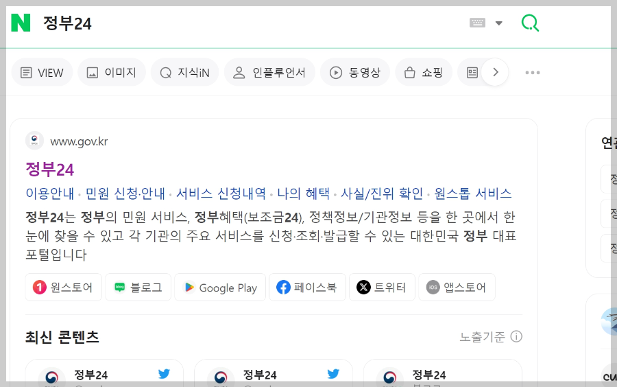 먼저 [통신판매업 폐업신고]를 하기 위해서는 [정부24] 홈페이지에 접속해 주셔야하는데요. 검색창에 [정부24] 입력하시면 아래 사진처럼 [정부24] 홈페이지 링크하나 보이실 거예요. [정부24] 홈페이지로 접속해줍니다.