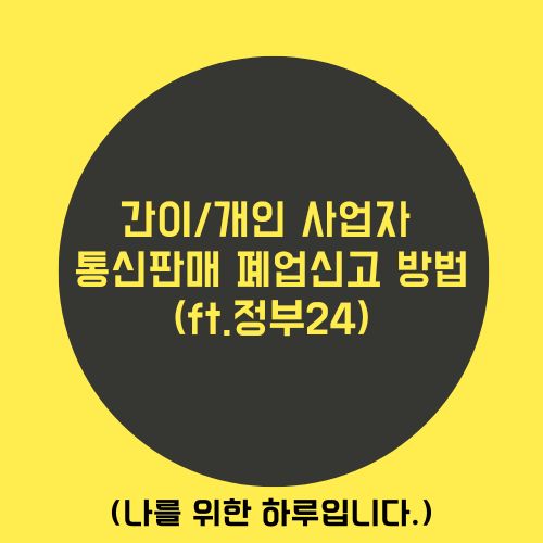 안녕하세요. 나를 위한 하루입니다. 오늘은 앞전에 포스팅 했던 [간이/개인 사업자 폐업신고 및 주의사항]에 이어서 [간이/개인 사업자 통신판매업 폐업신고방법]에 대해 누구나 따라하실 수 있도록 쉽게 풀어보았습니다. [사업자 폐업신고]는 홈택스에서 진행했잖아요? [통신판매업 폐업신고]는 [홈택스]가 아니라 [정부24]에서 진행하시면 됩니다. 제가 아래에 [간이/개인 사업자 폐업신고 하는 방법] 링크 달아놓을께요. 혹시 사업자폐업신고 전이시라면 아래 링크 타고가셔서 포스팅 보시고 차근차근 따라해보식 바랍니다.