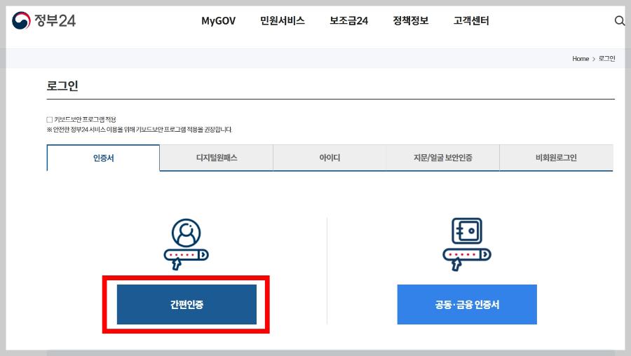 [정부24] 메인 페이지로 들어오셨다면 상단 우측에 [로그인]버튼 보이시나요? 로그인 해주시면 되는데 이용하시는 로그인 방법으로 해주면 됩니다. 저같은 경우 항상 [간편인증] 이용하고 있어서 저는 [간편인증] 서비스를 이용해 로그인했습니다.
