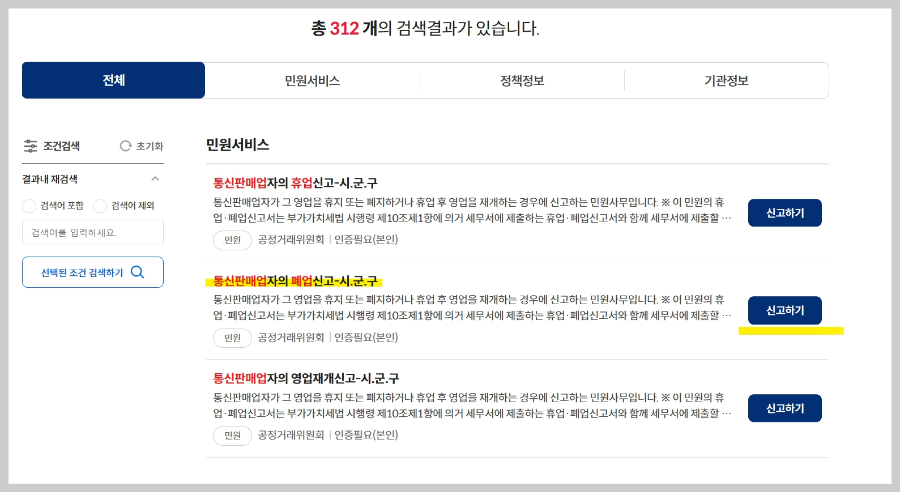 검색결과 리스트들을 보실 수 있으실텐데요. 쭈욱 보시면 [통신판매업자의 폐업신고]라는 구간 보이실거예요. [통신판매업자의 폐업신고] 우측 보시면 [신고하기] 버튼이 있습니다. 클릭해주세요.