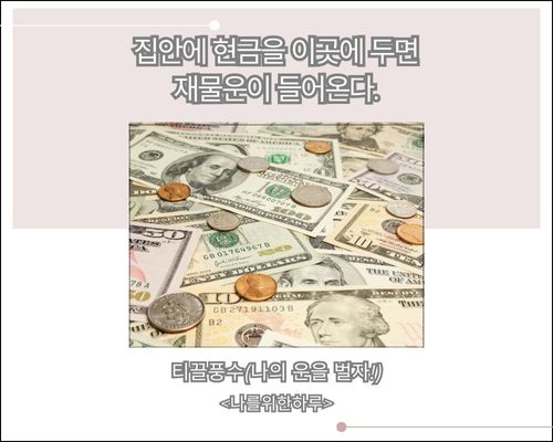 안녕하세요. 나를위한하루입니다. 오늘의 티끌풍수는 재물운이 들오는 풍수인데요. 나의 현금을 집안 어디에 두느냐에 따라 크게 재물운을 불러올 수 있다고 합니다. 너무 궁금하시지 않으신가요? (ㅎㅎㅎㅎ) 지금 바로 알아보도록 하겠습니다.