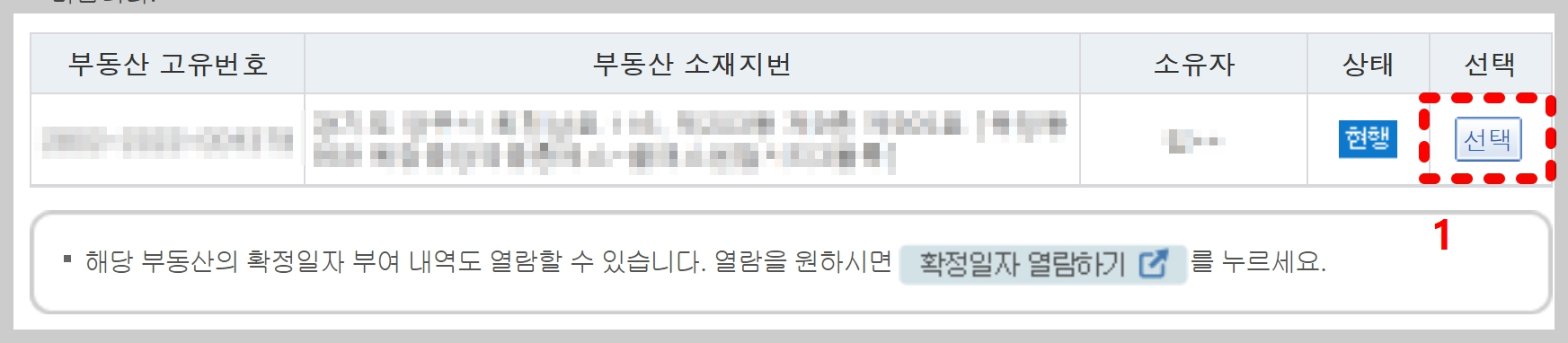 부동산 소재지번 맞게 되었는지 확인하시고, 이때 임대인 또는 매도인 성과 동일한지 확인을 꼭 해주세요. 소유자가 맞다면, 우측에 [선택] 버튼 클릭해 주세요.