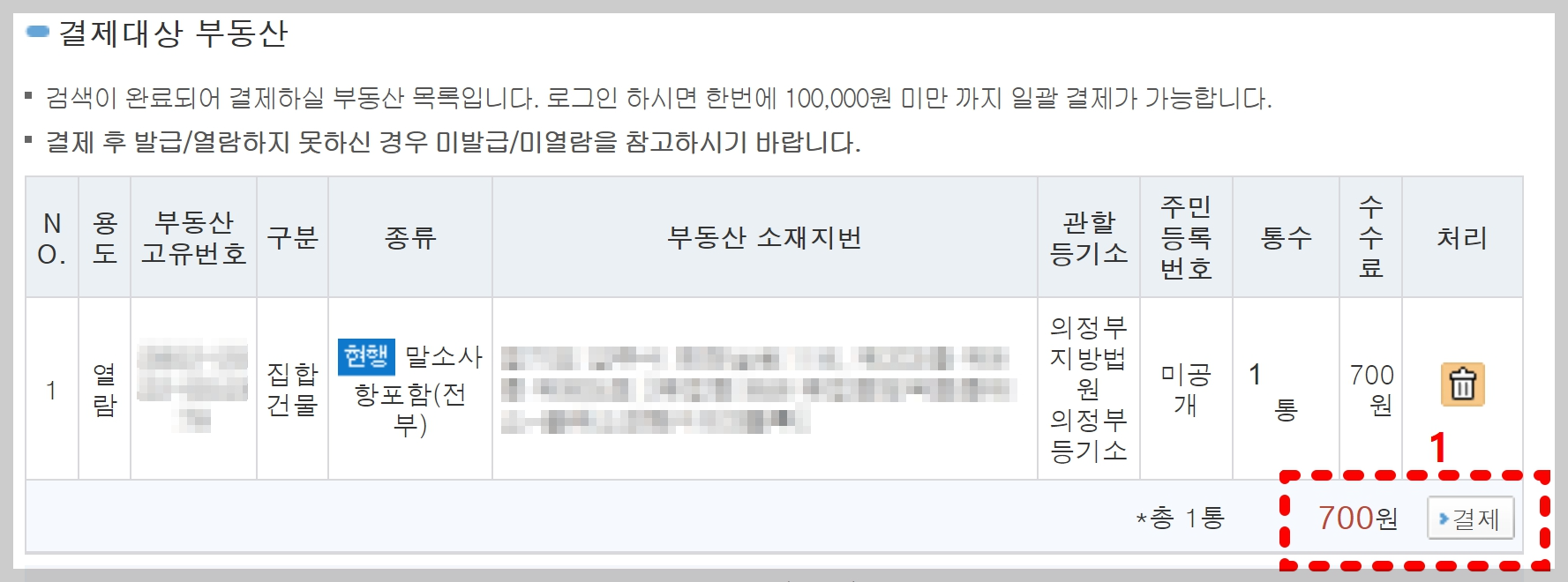 부동산 소재지번 한번 더 맞는지 확인하시고, 맞다면 [결제] 버튼 클릭!