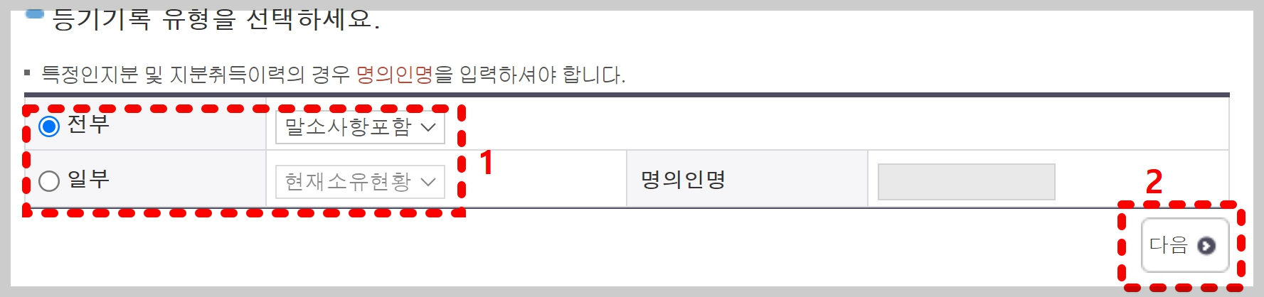 등기기록 유형을 선택해 주시면 되세요. 저같은 경우 [전부/말소사항포함] 선택해 주었습니다.