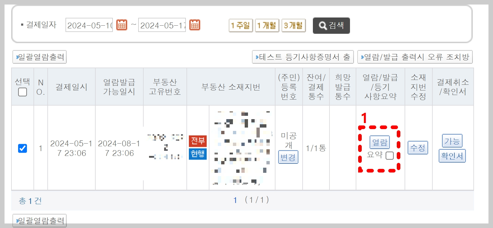 소재지번 맞게 설정이 되었는지 확인 한번 더 해주시고요. 소재지번 수정이 필요하다면 열람칸 옆에 [수정]버튼이 보이실거예요. 여기서 수정해 주시면 되고, 열람을 원하신다면