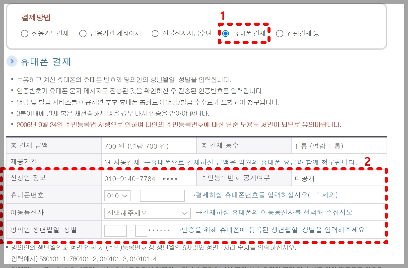- 결제방법을 입력해 줍니다. 저는 항상 [휴대폰 결제]를 이용해 주고 있어요.