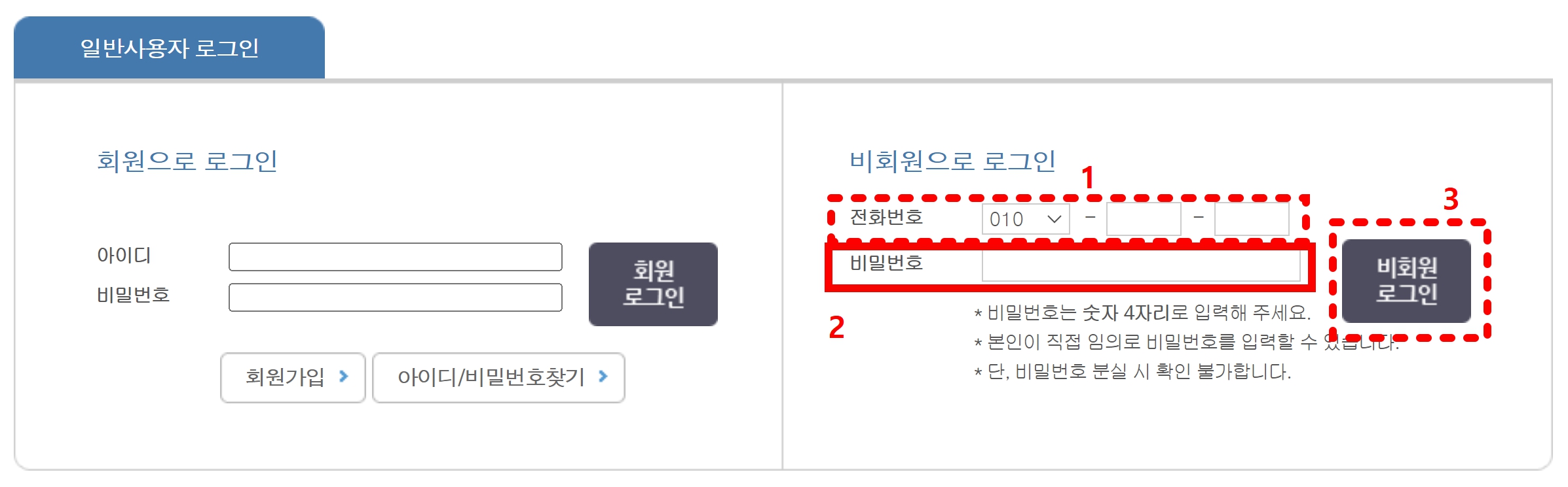- 비밀번호 : 임의의 비밀번호 4자리 입력하시고 꼭 기억해주시기 바랍니다. (재열람할때 필요)