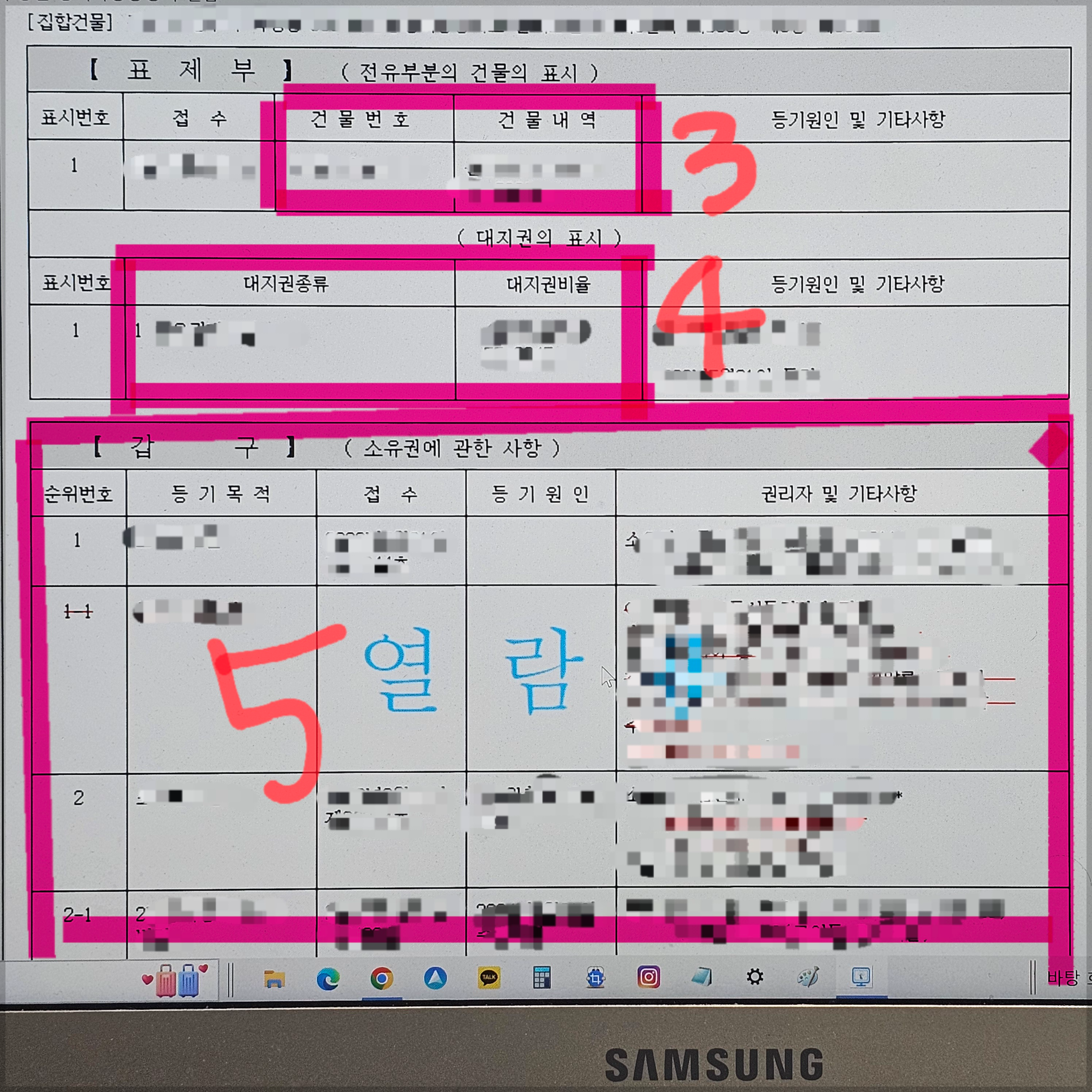 - [4번 영역] : 등기부상 해당 소재지번 호실을 취득할시 소유할 수 있는 대지권을 표시한 칸입니다.