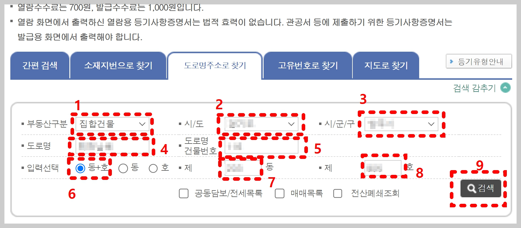 - 도로명 건물번호 : 선택