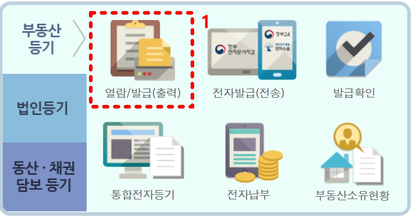 메인페이지 가운데 보시면 부동산 등기 목로에 [열람/발급(출력)] 키워드 보이실 거예요. 클릭해 주세요.