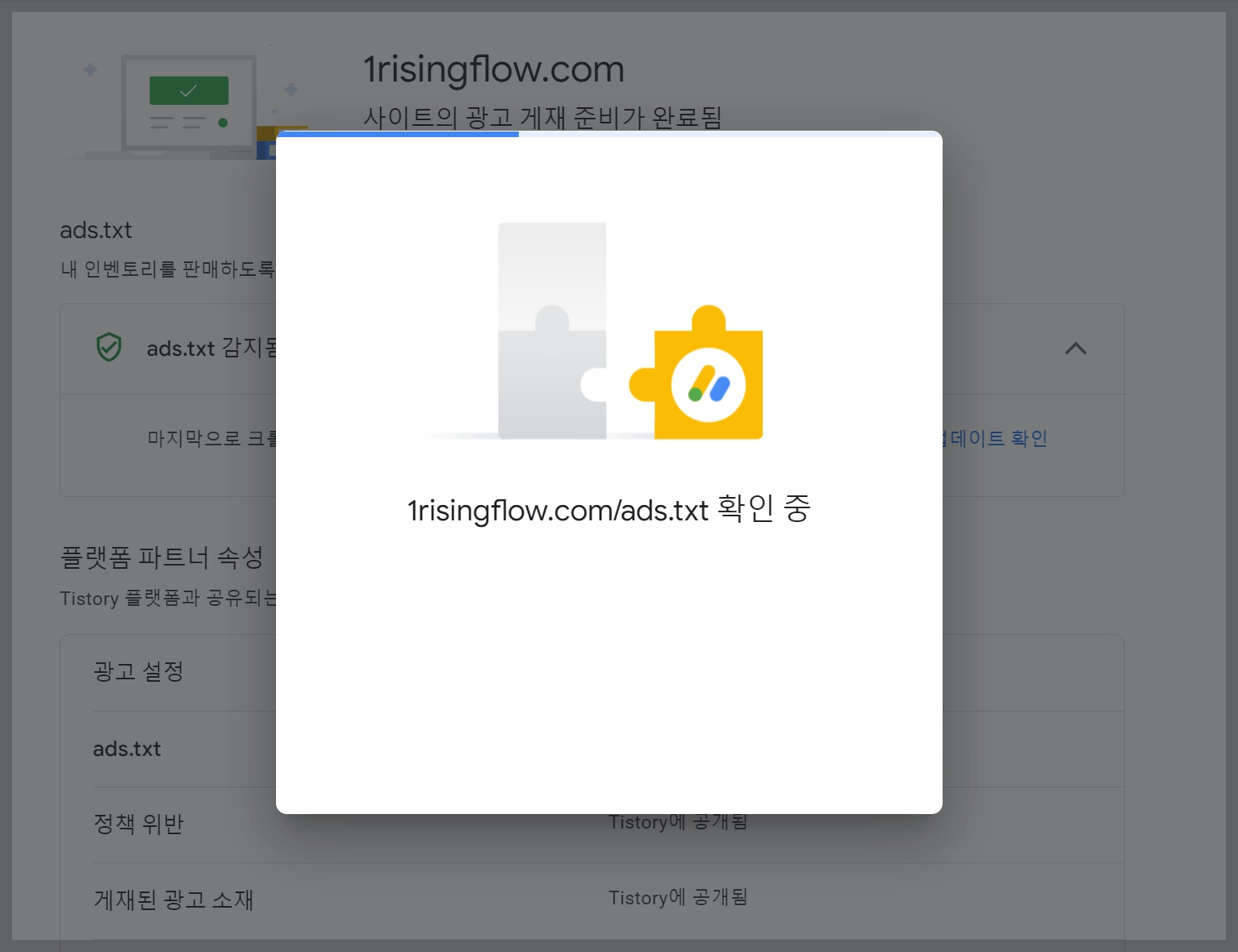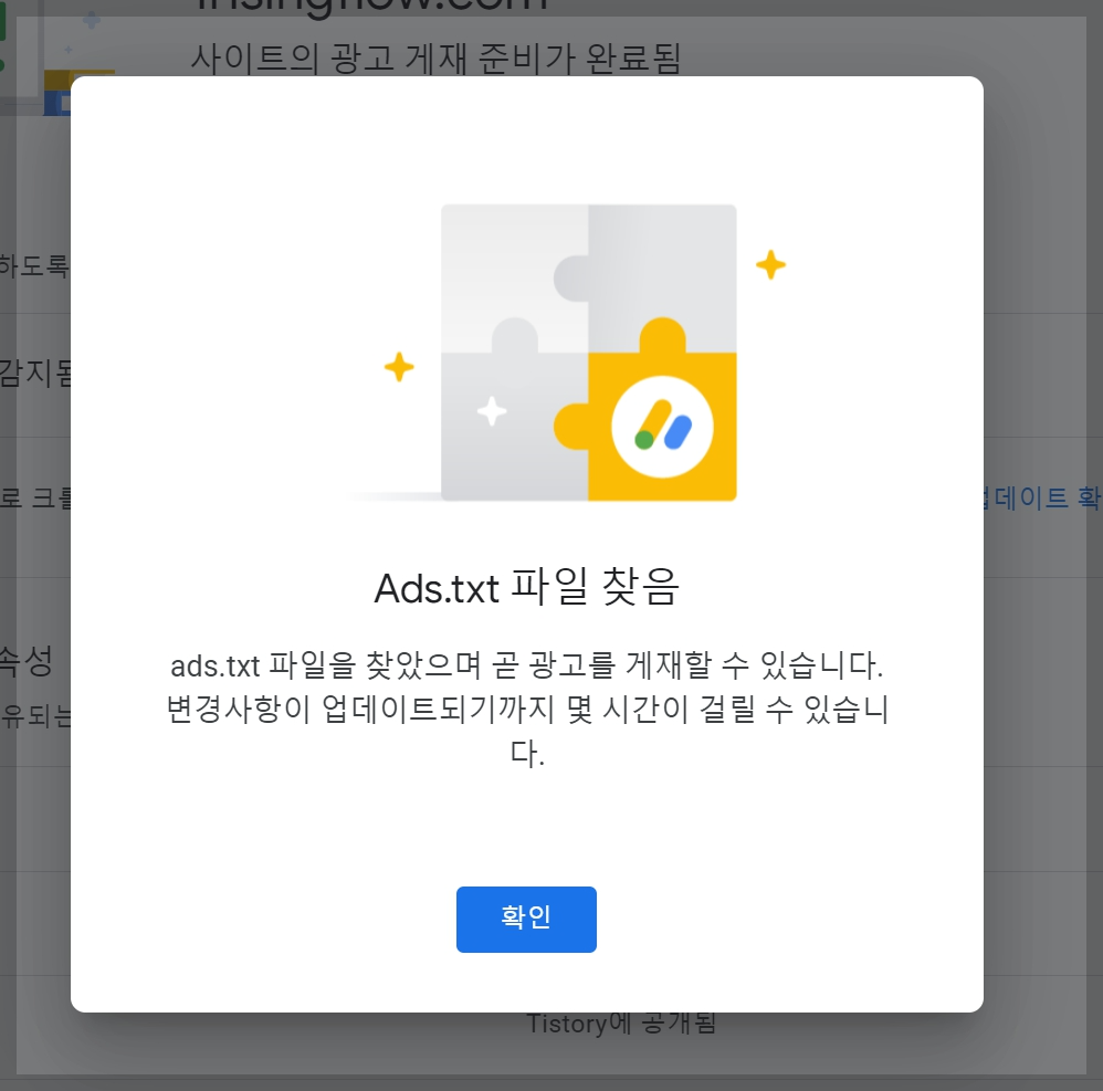 - [Ads.txt 파일 찾음]" ads.txt 파일을 찾았으며 곧 광고를 게재할 수 있습니다. 변경사항이 업데이트되기까지 몇 시간이 걸릴 수 있습니다. " 라는 문구가 보이실거에요. 그러면 잘 따라와 주신겁니다. 고생하셨습니다. 끝난거예요