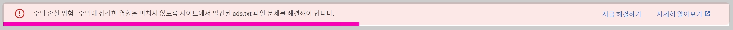 - 애드센스 사이트에 접속해 줍니다. 그러면 메인 페이지에 상단에 핑크색 칸에 [수익 손실 위험 - 수익에 심각한 영향을 미치지 않도록 사이트에서 발견된 ads.txt. 파일문제를 해결해야 합니다.] 이라는 문구가 위협적으로 표시되어 있는게 보이시나요? 만약 이런 문구가 보이신다면 겁내시지 마세요. 생각보다 쉽게 해결하실 수 있으세요.