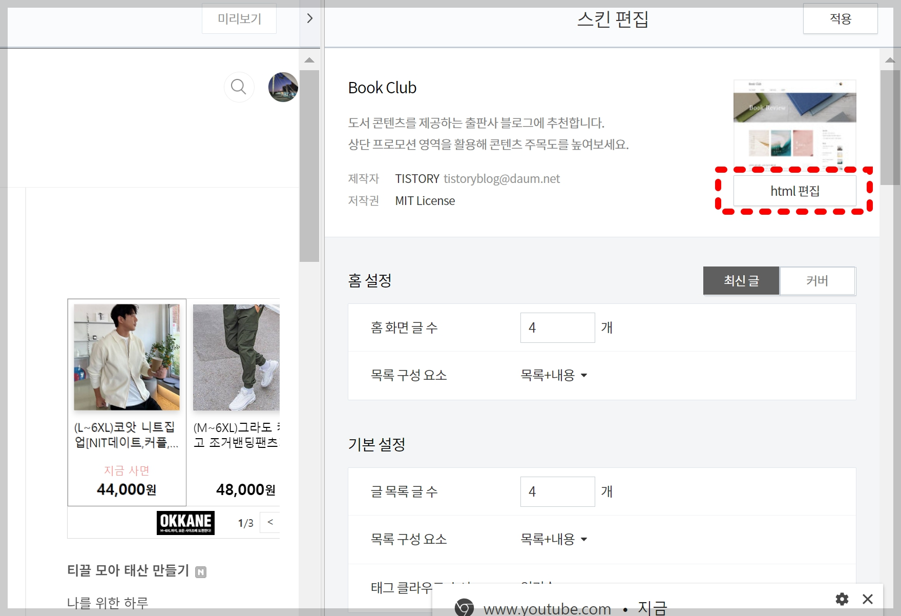 - [꾸미기] -> [스킨편집] 클릭해 주세요.