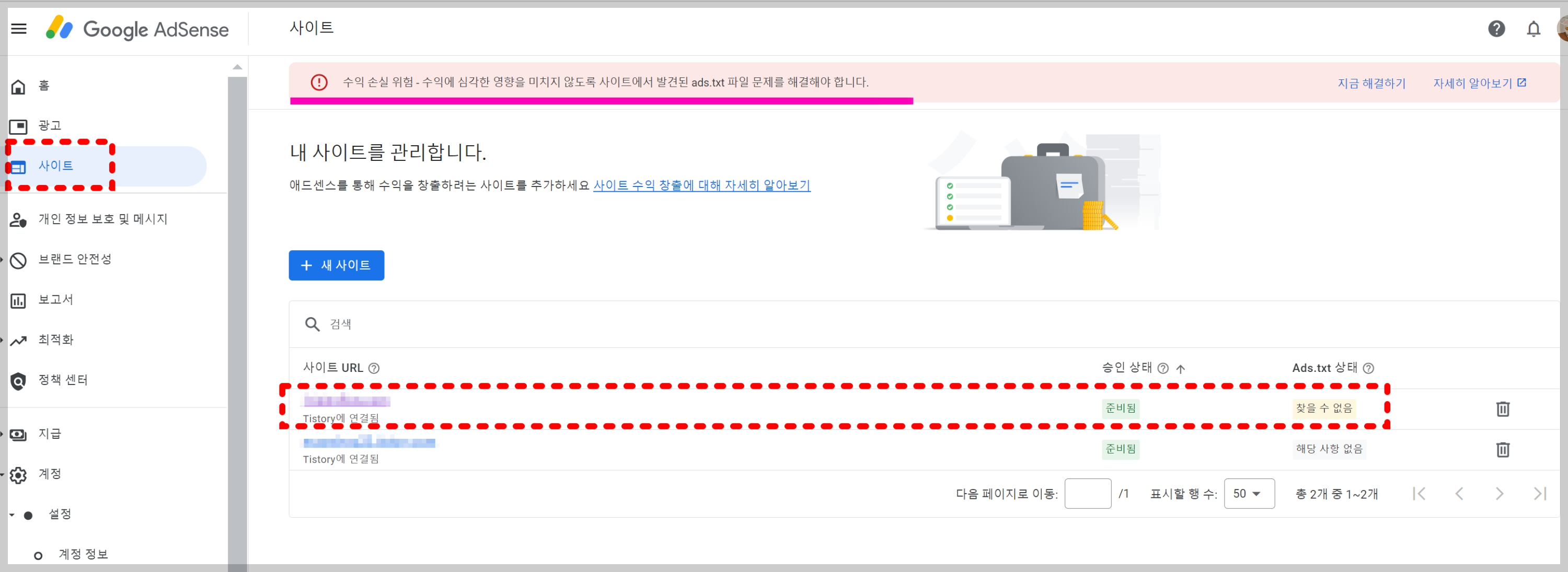 안녕하세요. 티끌모앙입니다. 오늘의 티끌정보 주제는 수익손실위험 ads.txt 파일문제해결방법에 대해 알아보도록 할건데요.티스토리 블로그를 운영하다 보면 철렁 심장이 내려앉는 상황의 문제들을 맞닥드리고는 합니다. 전 애드센스 승인만 받으면 승승장구 열심히 글 써서 돈을 벌 수 있겠구나! 했는데 운영하면서도 해결해야할 다양한 문제들을 접하게 됩니다. 그 중 하나인 수익손실에 영향을 미치는 ads.txt. 파일문제가 저에게도 찾아왔어요. 애드센스 운영하다보면 하루에 한번씩은 애드센스 사이트에 접속해 보시잖아요? 전 매일 한번씩 두번씩 방문하거든요. 그런데 그러던 어느날 아래 사진처럼 페이지 상단에 [수익 손실 위험 - 수익에 심각한 영향을 미치지 않도록 사이트에서 발견된 ads.txt. 파일문제를 해결해야 합니다.] 라는 문구가 계속 뜨는거예요. 수익손실? 지금도 수익이 그리 많지 않는데 여기서 더 수익손실이 발생한다고? 신경이 엄청 쓰이는 거예요. 애드센스를 운영하면서 생기는 이런 문제들은 아무 조치하지 않아도 시간이 지나면 자연스럽게 해결된다는 글을 본적이 있어서 저도 며칠 두고 보았어요. 그런데 홈페이지 접속할때 마다 이 문구가 빨강색으로 제일 먼저 눈에 띄다보니깐 신경이 쓰이더라고요. 그래서 해결해야겠다 싶어 인터넷으로 폭풍 검색을 하였지요. 어떤분의 글을 보면 그냥 두면 자연스럽게 시간 지나면 해결된다고 하시는데 저는 계속 볼때마다 찜찜하더라고요. 그래서 해결해보았어요. 그런데 생각보다 쉬워요. 제가 지금부터 하나하나씩 자세하게 설명해드릴께요. 천천히 따라오신다면 어렵지 않게 해결하실 수 있으실거예요. 그럼 지금 바로 시작해 보도록 하겠습니다.