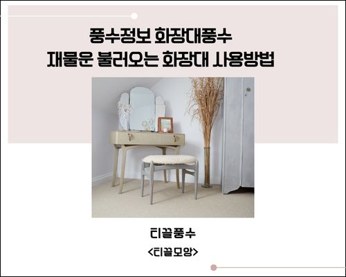 안녕하세요. 티끌모앙입니다. 오늘의 티끌풍수는 앞전에 예고드린 주제로 화장대풍수 2탄를 시작해 보려고 하는데요. 전 시간에 화장대풍수 피해야 하는 물건에 대해 이야기를 나누어 보았는데요. 오늘은 재물운이 마구마구 들어오는 화장대 사용방법에 대해서 이야기 해보려고 합니다. 그럼 지금 바로 시작해 보도록 할께요. 오늘도 재미있게 읽어주시기 바랍니다.